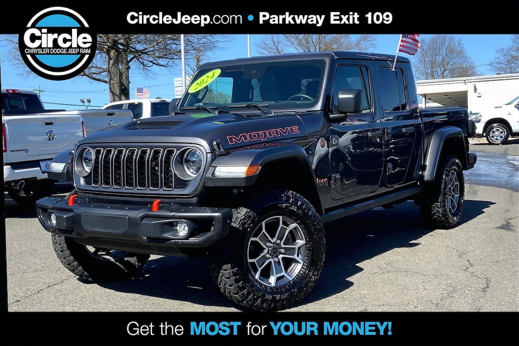 WE ARE OPEN FOR ALL YOUR SALES AND SERVICE NEEDS! COMPLETE ONLINE BUYING EXPERIENCE AVAILABLE! Circle CDJR is proud to offer this wonderful 2024 Jeep Gladiator an absolutely stunning Truck with the following Features: Dual Top Group (Black 3-Piece Hard Top, Premium Black Sunrider Soft Top, and Rear Window Defroster), Dual Top Group w/2A, Quick Order Package 24A Mojave X (12.3" Touchscreen Display, 4G LTE Wi-Fi Hot Spot, Alexa Built-In, Apple CarPlay, Connectivity - US/Canada, Google Android Auto, Integrated Center Stack Radio, SiriusXM Radio Service, SiriusXM w/360L, and USB Host Flip), Smoker's Group (Cigar Lighter), FCA US LLC Certified Pre-Owned Certified, 4-Wheel Disc Brakes, 8 Speakers, 97 MPH Vehicle Max Speed Calibration, ABS brakes, Air Conditioning, Alloy wheels, AM/FM radio: SiriusXM with 360L, Apple CarPlay/Android Auto, Automatic temperature control, Brake assist, Compass, Delay-off headlights, Driver door bin, Driver vanity mirror, Dual front impact airbags, Dual front side impact airbags, Electronic Stability Control, Emergency communication system: Jeep Connect, Front anti-roll bar, Front Bucket Seats, Front Center Armrest w/Storage, Front dual zone A/C, Front fog lights, Front reading lights, Fully automatic headlights, Heated door mirrors, Heavy Duty Suspension w/Gas Shocks, Illuminated entry, Integrated roll-over protection, Jeep Trail Rated Kit, Leather steering wheel, Low tire pressure warning, Manufacturer's Statement of Origin (DISC), MOPAR Black Hood Graphic, MOPAR Hard Tri-Fold Tonneau Cover, MOPAR Spray In Bedliner, Occupant sensing airbag, Outside temperature display, Overhead airbag, Panic alarm, Passenger door bin, Passenger vanity mirror, Power door mirrors, Power steering, Power windows, Premium Cloth Seats w/Sport Bolsters, Radio data system, Radio: Uconnect 5 w/12.3" Display, Rear anti-roll bar, Rear reading lights, Remote keyless entry, Security system, Speed control, Split folding rear seat, Steering wheel mounted audio controls, Tachometer, Telescoping steering wheel, Tilt steering wheel, Traction control, Trip computer, Variably intermittent wipers, Voltmeter, Wheels: 17" x 7.5" Dark Gray Painted, and Wheels: 17" x 7.5" Machined/Painted Dark Gray. Odometer is 2340 miles below market average!
