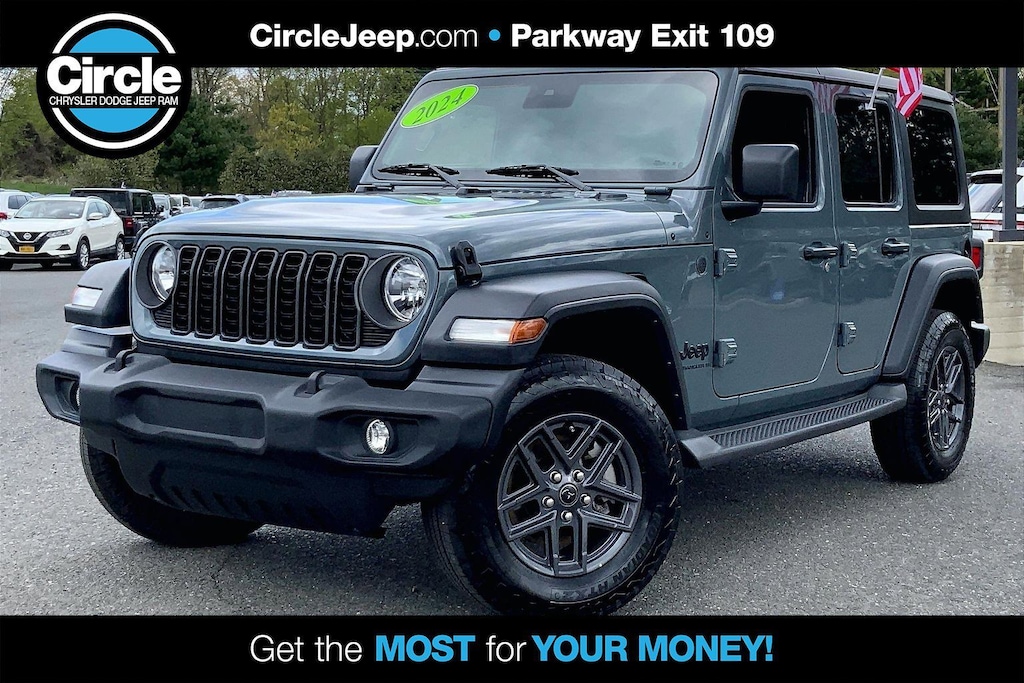 WE ARE OPEN FOR ALL YOUR SALES AND SERVICE NEEDS! COMPLETE ONLINE BUYING EXPERIENCE AVAILABLE! Circle CDJR is proud to offer this good-looking and fun 2024 Jeep Wrangler a truly superb SUV with the following Features: Convenience Group (2-Door Passive Entry, Front Door Locks, Air Conditioning w/Auto Temperature Control, Air Filtering, Cluster 7.0" TFT Color Display, Emergency/Assistance Call, Heated Front Seats, Heated Steering Wheel, Remote Start System, and Universal Garage Door Opener), Quick Order Package 24S Sport S (Advanced Brake Assist, Automatic Headlamps, Corning Gorilla Glass, Deep Tint Sunscreen Windows, Enhanced Adaptive Cruise Control, Front 1-Touch Down Power Windows, Full Speed Forward Collision Warning Plus, Power Heated Mirrors, Premium Wrapped Steering Wheel, Remote Keyless Entry, Security Alarm, Speed Sensitive Power Locks, Sport S, Sun Visors w/Illuminated Vanity Mirrors, and Wheels: 17" x 7.5" Gray), FCA US LLC Certified Pre-Owned Certified, 110 MPH Vehicle Max Speed Calibration, 3.45 Overall Top Gear Ratio, 4-Wheel Disc Brakes, 8 Speakers, ABS brakes, Air Conditioning, AM/FM radio, Apple CarPlay/Android Auto, Aux Battery, Black 3-Piece Hard Top, Brake assist, Cloth Low-Back Bucket Seats, Compass, Delay-off headlights, Driver door bin, Driver vanity mirror, Dual front impact airbags, Dual front side impact airbags, Electronic Stability Control, Freedom Panel Storage Bag, Front anti-roll bar, Front Bucket Seats, Front Center Armrest w/Storage, Front fog lights, Front reading lights, Integrated roll-over protection, Low tire pressure warning, MOPAR All-Weather Floor Mats, No Soft Top, Non-Lock Fuel Cap w/o Discriminator, Normal Duty Suspension, Occupant sensing airbag, Outside temperature display, Overhead airbag, ParkView Rear Back-Up Camera, Passenger door bin, Passenger vanity mirror, Power steering, Radio data system, Radio: Uconnect 5 w/12.3" Display, Rear anti-roll bar, Rear reading lights, Rear Window Defroster, Rear Window Wiper/Washer, Speed control, Split folding rear seat, Steering wheel mounted audio controls, Stop-Start Dual Battery System, Tachometer, Telescoping steering wheel, Tilt steering wheel, Traction control, Trip computer, Variably intermittent wipers, and Wheels: 17" x 7.5" Black Steel Styled.