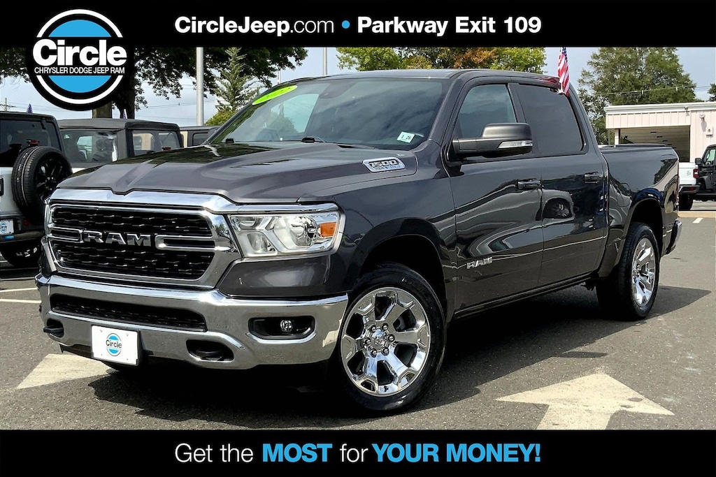 WE ARE OPEN FOR ALL YOUR SALES AND SERVICE NEEDS! COMPLETE ONLINE BUYING EXPERIENCE AVAILABLE! Circle CDJR is proud to offer this charming 2022 Ram 1500 an absolutely gorgeous-looking Truck with the following Features: Big Horn Level An Equipment Group (DISC) (2nd Row In Floor Storage Bins, 4G LTE Wi-Fi Hot Spot, 8.4" Touchscreen Display, Apple CarPlay, Auto-Dimming Exterior Driver Mirror, Auto-Dimming Rear-View Mirror, Black Premium Power Mirrors (GUL), Bluetooth Handsfree Phone & Audio, Class IV Receiver Hitch, Cluster 3.5" TFT Color Display, Connectivity - US/Canada, Exterior Mirrors Courtesy Lamps, Exterior Mirrors w/Supplemental Signals, Foam Bottle Insert (Door Trim Panel), For More Info, Call 800-643-2112, Glove Box Lamp, Google Android Auto, Integrated Center Stack Radio, Power 2-Way Driver Lumbar Adjust, Power 8-Way Driver Seat, Power Adjustable Pedals, Radio: Uconnect 5 W w/8.4" Display, Rear Dome w/On/Off Switch Lamp, Rear Power Sliding Window, Rear Window Defroster, SiriusXM Radio Service, SiriusXM Satellite Radio, Sun Visors w/Illuminated Vanity Mirrors, Universal Garage Door Opener, and USB Host Flip), Protection Group (Tow Hooks), Quick Order Package 27Z Big Horn (Big Horn Badge), FCA US LLC Certified Pre-Owned Certified, 3 Rear Seat Head Restraints, 3.21 Rear Axle Ratio, 4 Way Front Headrests, 4-Wheel Disc Brakes, 48V Belt Starter Generator, 6 Speakers, ABS brakes, Air Conditioning, Alloy wheels, AM/FM radio, Black Exterior Mirrors, Brake assist, Bumpers: chrome, Cloth Bench Seat, Cluster 7.0" TFT Color Display, Compass, Connected Services Delete Credit, Convex Wide-Angle Mirror Insert, Delay-off headlights, Driver door bin, Dual front impact airbags, Dual front side impact airbags, Electronic Stability Control, Emergency communication system: SiriusXM Guardian, Front anti-roll bar, Front Center Armrest w/Storage, Front fog lights, Front License Plate Bracket, Front reading lights, Front Seat Back Map Pockets, Front wheel independent suspension, Fully automatic headlights, Global Telematics Box Module (TBM), GPS Antenna Input, Heated door mirrors, Heavy-Duty Engine Cooling, Illuminated entry, Integrated Voice Command w/Bluetooth, Leather steering wheel, Low tire pressure warning, Manufacturer's Statement of Origin, Occupant sensing airbag, Outside temperature display, Overhead airbag, Overhead console, Panic alarm, ParkView Rear Back-Up Camera, Passenger door bin, Passenger vanity mirror, Power door mirrors, Power steering, Power windows, Radio data system, Radio: Uconnect 3 w/5" Display, Rear 60/40 Folding Seat, Rear anti-roll bar, Rear seat center armrest, Rear step bumper, Rear Underseat Compartment Storage (DISC), Remote keyless entry, Speed control, Split folding rear seat, Steering wheel mounted audio controls, Tachometer, Telescoping steering wheel, Tilt steering wheel, Traction control, Trip computer, Variably intermittent wipers, Voltmeter, Wheels: 18" x 8" Cast-Aluminum Painted, and Wheels: 20" x 9" Aluminum Chrome Clad (WRK)