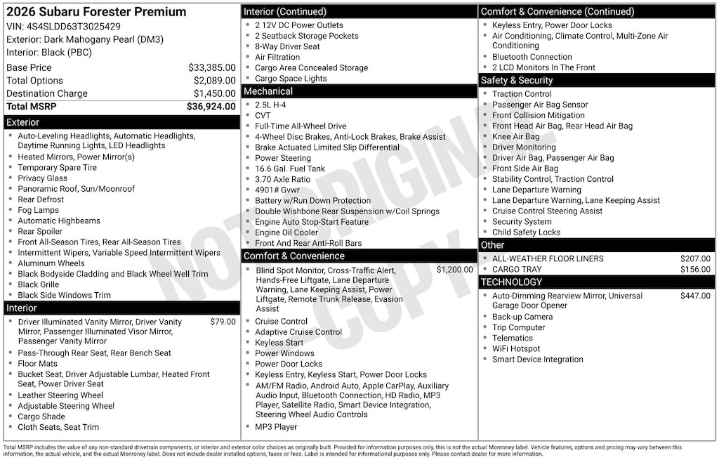 * Although every reasonable effort has been made to ensure the accuracy of the information contained on this site, absolute accuracy cannot be guaranteed. This site, and all information and materials appearing on it, are presented to the user "as is" without warranty of any kind, either express or implied, including but not limited to the implied warranties of merchantability, fitness for a particular purpose, title or non-infringement. All vehicles are subject to prior sale. Price does not include applicable fees, tax, title, and license; Doc Fee is $799. Not responsible for typographical errors. **The arrival timeline is an estimate. It may vary due to circumstances beyond Subaru’s or the retailer’s control.